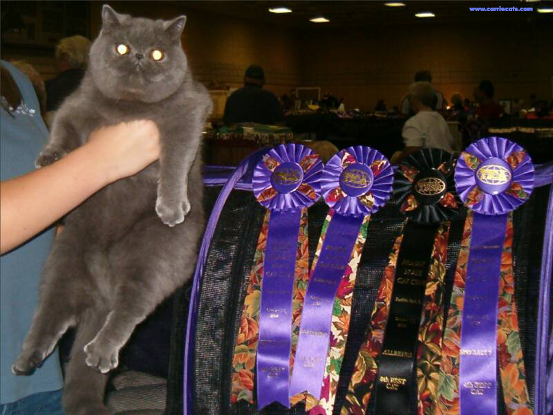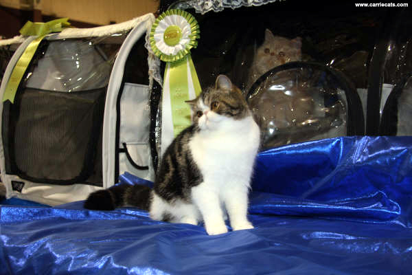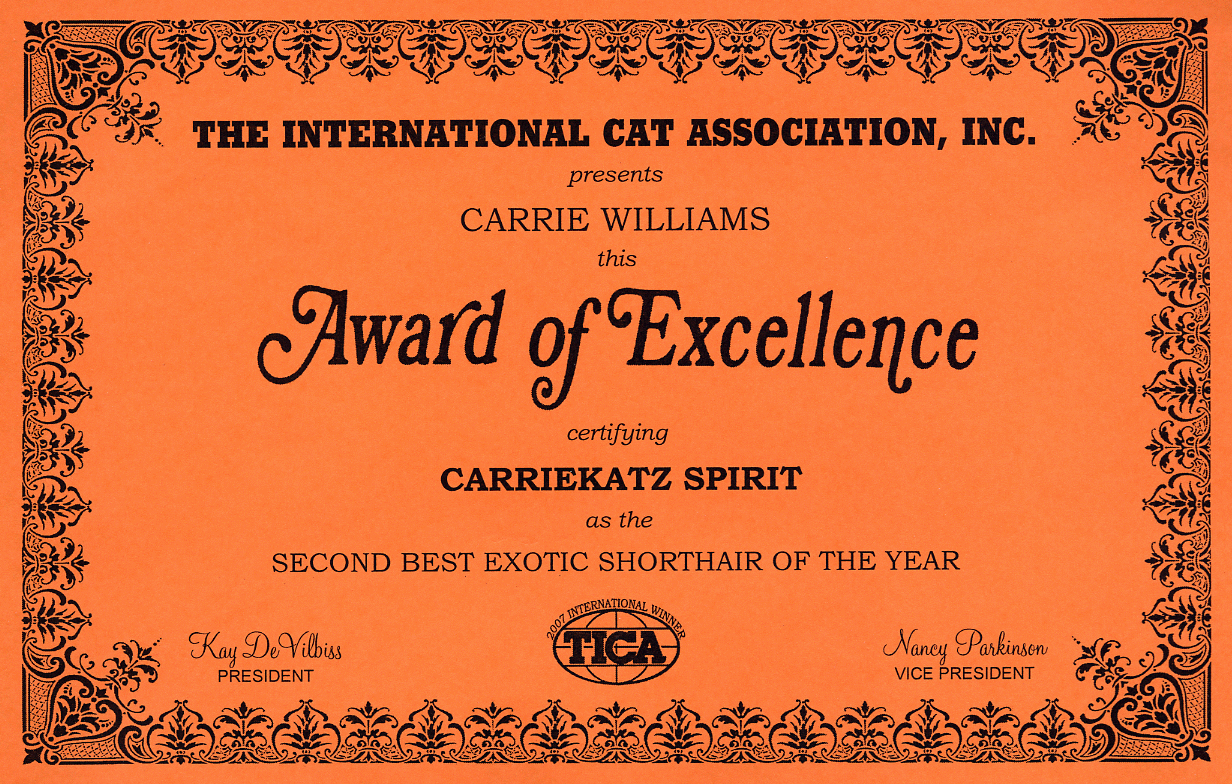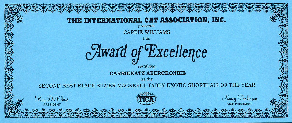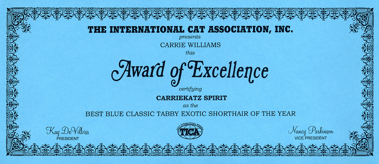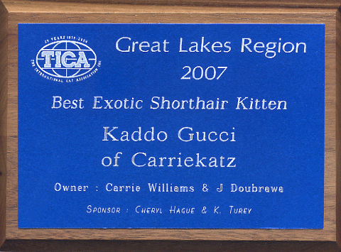 | AWARDS We are proud to say that for the 2007 season we achieved 2nd National Best Exotic Adult for Carriekatz Spirit, 2nd National Best Black/Sivler Mack Tabby Carriekatz Abercrombie and 1st Regional Best Exotic Kitten for Kaddo’s Gucci of Carriekatz |